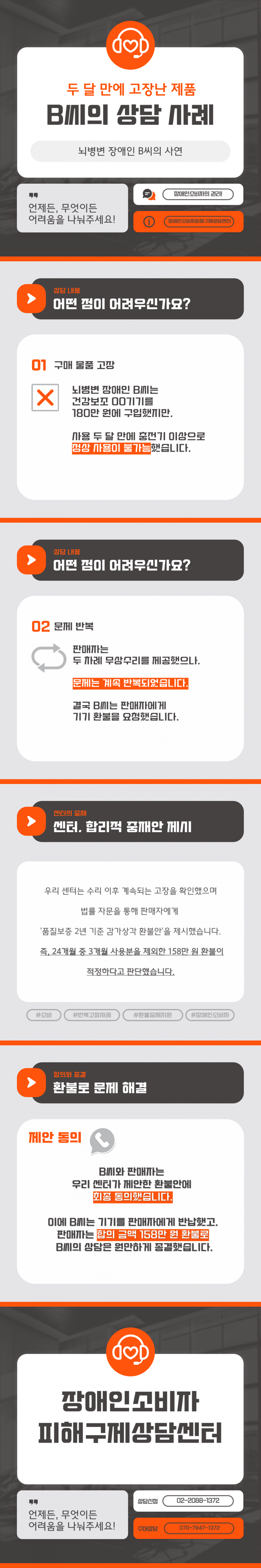뇌병변 장애인 B씨는 “세 달 사용 시 신체가 완전히 호전된다”는 방문판매원의 발언을 통해, 기대감을 가지고 건강 치료기기 ○○제품을 180만 원에 구입했습니다. 그러나 제품은 사용 두 달 만에 충전기 이상으로 정상적인 사용이 불가능해졌고, 이에 따라 기계구매 피해구제를 우리 센터에 요청했습니다.