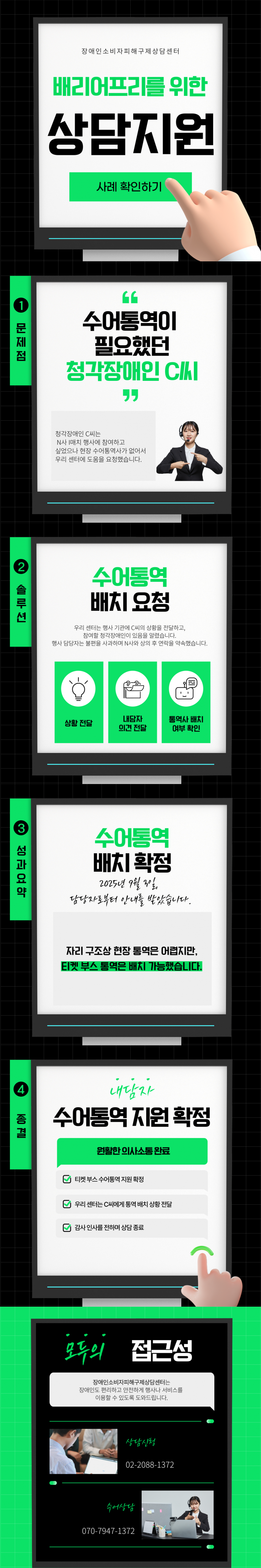 청각장애인 C씨는 N사 I매치 행사에 참여하고자 수어 통역이 필요하여 통역사 배치 요청을 위해 우리 센터에 도움을 요청했습니다.