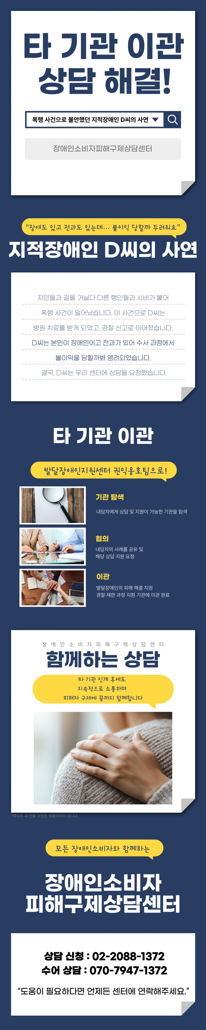 우리 센터는 여러 기관에 D씨의 사례를 전달한 끝에 ○○발달 장애인지원센터 권익옹호팀에서 도움을 드릴 수 있다는 답변을 들었습니다. 발달 장애인이 겪은 피해나 문제를 조사해 해결을 돕고 경찰서에 가야하거나 재판을 받아야 할 때도 지원을 해준다는 답변이었습니다.