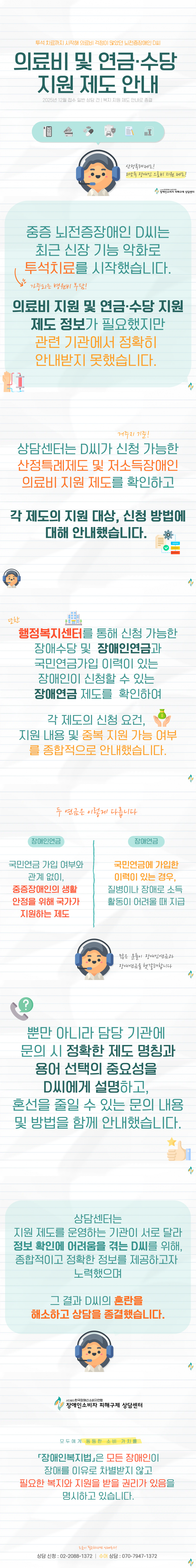 중증 뇌전증장애인 D씨는 최근 시작한 투석 치료로 인해 의료비 부담이 크고 이에 따른 경제적 어려움을 겪고 있었습니다. 이에 D씨는 본인이 이용 가능한 의료비 지원 및 연금·수당 지원 제도에 대한 정보가 필요했고 관련 기관에 문의했지만, 문의 과정에서도 어려움을 느껴 피해구제 상담센터에 안내를 요청했습니다.