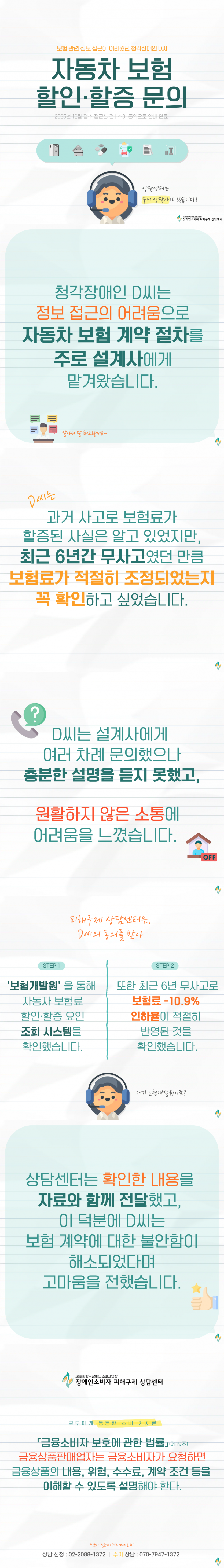 청각장애인 D씨는 자동차 보험을 계약할 때 , 정보 접근이 쉽지 않아 절차 대부분을 설계사에게 맡겨왔습니다. 이전 사고 이력으로 보험료가 할증된 사실은 알고 있었지만, 지난 6년 동안 무사고로 안전하게 운전해 온 만큼 보험료의 할인, 할증이 적절히 조정되었는지를 확인하고 싶어 이를 설계사에게 여러 차례 문의했으나 충분한 안내를 받지 못했고, 원활하지 않은 소통으로 어려움을 느낀 D씨는 자동차 보험 계약의 세부 내용을 직접 확인하기 위해 피해구제 상담센터에 도움을 요청했습니다.