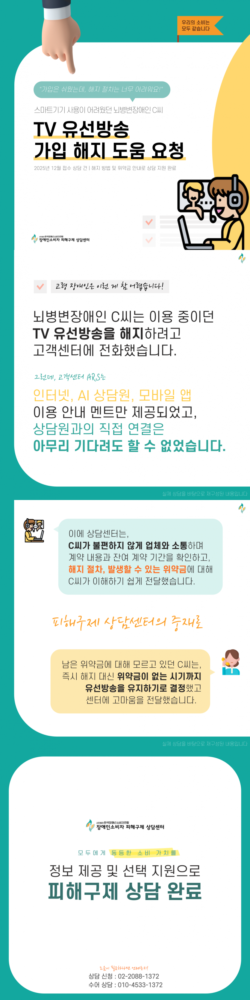 고령의 뇌병변장애인 C씨는 현재 이용 중인 TV 유선방송 상품을 해지하기 위해 본사 고객센터에 연락했습니다. 그러나 해지는 인터넷, AI 상담원, 모바일 앱을 통해 신청하라는 안내 설명이 이어질 뿐, 정작 C씨가 원한 상담원 전화 연결은 어려웠습니다. 계속된 시도에도 결국 상담원 전화 연결이 되지 않자, C씨는 피해구제 상담센터에 도움을 요청했습니다.