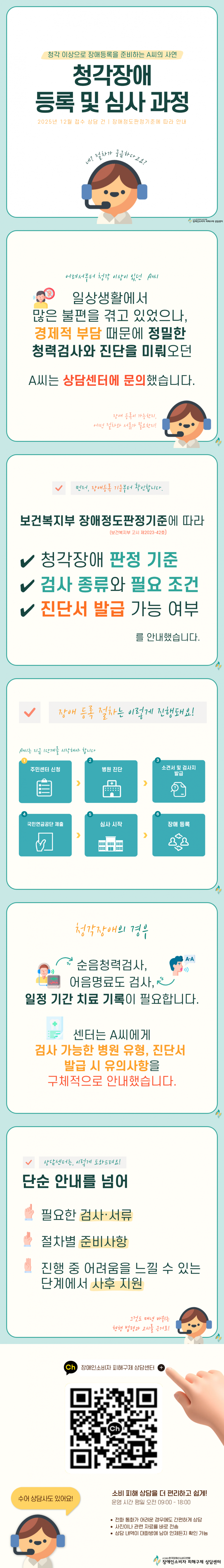 상담센터는 장애정도판정기준(보건복지부 고시 제2023-42호)에 따라 청각장애 판정 기준, 검사 종류와 필요조건, 진단서 발급 가능 여부를 먼저 안내했습니다. 장애등록은 거주지 담당 행정복지센터 사전 상담 후 신청하고, 국민연금공단에서 전문의 검사 및 소견이 포함된 진단 서류를 토대로 진행되며, 서류 검토 및 자료 보완 요청 과정을 거쳐 심사가 완료됩니다.
