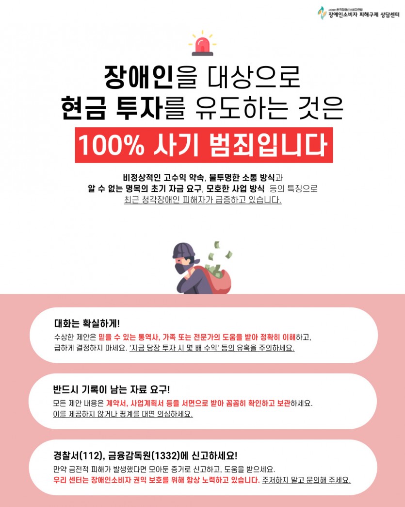 최근 저희 센터로 농인(청각장애인) 부모님을 대상으로 한 수상한 투자 제안 문의가 있었습니다.